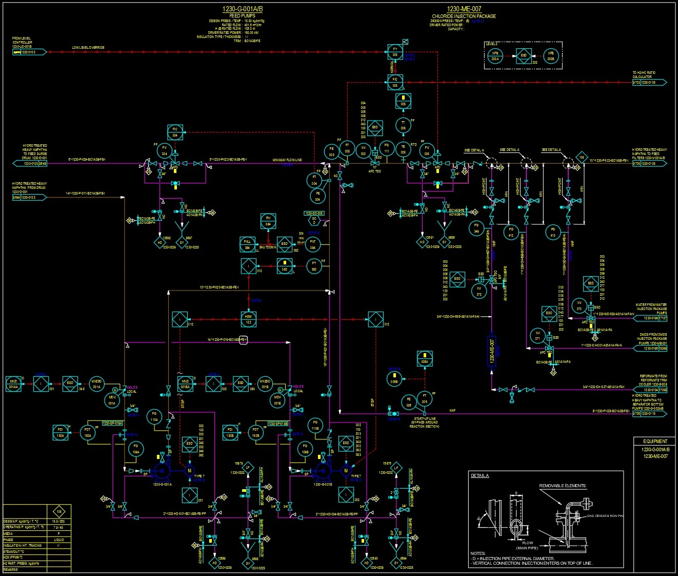 Our CAD drafting services include the creation of detailed Piping & Instrumentation Diagrams (P&IDs), also known as Process Engineering Flow Schemes (PEFS). Unlike Process Flow Diagrams (PFDs), P&IDs provide a comprehensive, single-line schematic that includes all equipment, instruments, control systems, major valves, line sizes, and pipe specifications. P&IDs serve as a master reference document for all engineering disciplines, guiding design, construction, and operational decisions. They contain the critical data required for other design groups to progress with detailed design work, fabrication, and installation, ensuring coordination, accuracy, and efficiency across the entire project lifecycle.