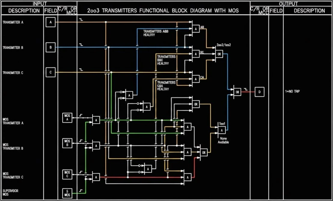 Design of Cause & Effect and Logic Diagrams for Control and Safety Instrumented Systems, illustrating initiators, Final element Interlocks, Permissive, Voting Logic, Alarms, Maintenance overrides and Functional sequences. Ensures proper control strategies and safe operational behaviour. Supports Commissioning, Troubleshooting, and Compliance with Industry Standards.