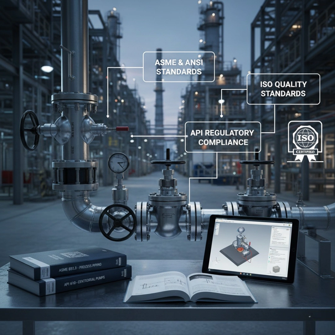 All piping layouts are developed in strict accordance with ASME, API, ANSI, and ISO standards, ensuring safety, quality, and regulatory compliance.